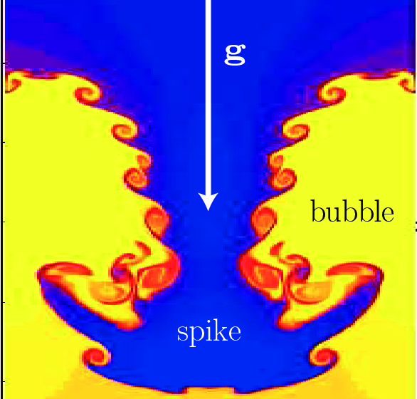 밀도 높은 유체 위에 밀도 낮은 유체가 있을 때, 중력 방향으로 '손가락 모양 돌기가 생기며 불안정이 증폭된다. 핵폭발 열기둥이 고밀도 대기를 밀어 올리는 과정에서 나타난다.