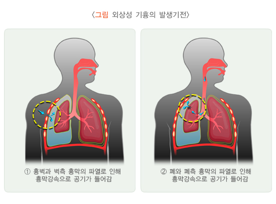 - 호흡 곤란: 공기 축적으로 인해 폐가 찌그러지면서 환기 장애가 발생하고 심한 호흡 곤란을 겪을 수 있다.