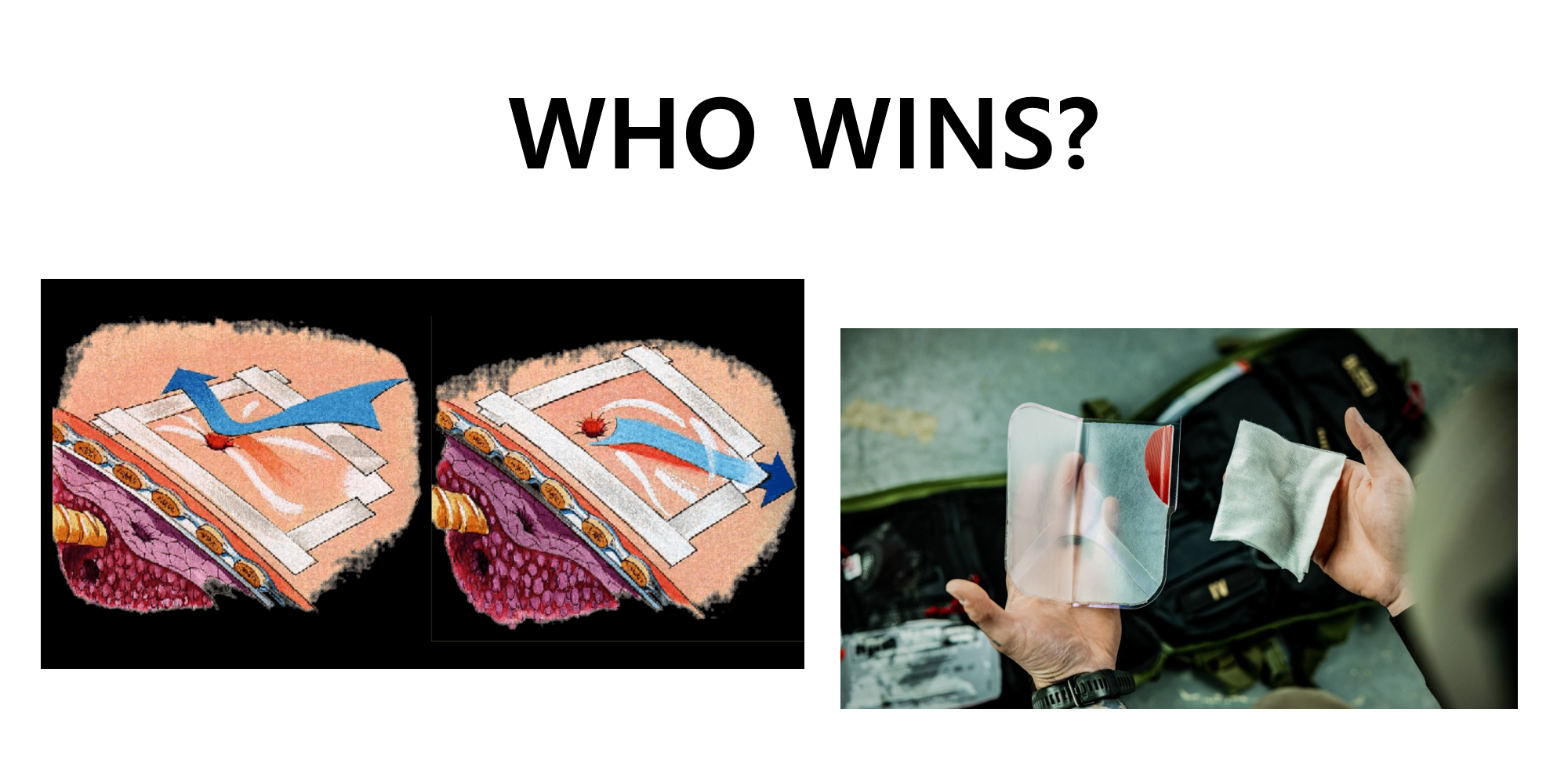 | 효용성 | 외부공기 유입 차단 흉강 내 공기를 배출 (이론적) | 향상된 밀폐력과 내구성 습기, 공기, 오염물로부터 보호 장거리 후송에 적합 |