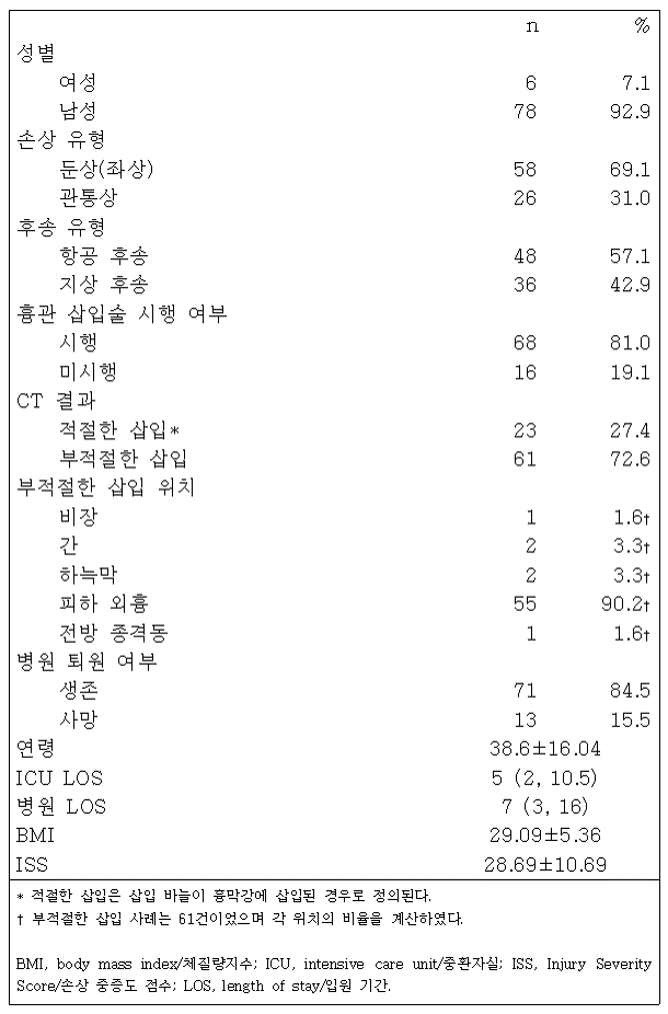 최종적으로 포함된 84명의 환자 중 대다수는 남성이었으며(n=78, 92.9%), 둔상 외상을 입었고(n=58, 69.1%), TT을 시행받았으며(n=68, 81%), 육상 후송으로 도착했다(n=48, 57.1%). 평균 연령은 38.6세(SD=16.04), 평균 BMI는 29.1kg/m²(SD=5.36), 평균 ISS는 28.69(SD=10.69)였다. 흉막강 내에 적절하게 NT가 삽입된 경우는 27.4%(n=23)에 불과했다. 전체 환자 중 단지 81.0%(n=64)만이 이후 흉관삽관술을 필요로 했다. NT 시도 과정에서 5명의 환자에서 의료행위로 인한 손상이 발생했다. 한 명은 비장에 삽입되었고, 두 명은 간에 삽입되었으며, 두 명은 횡격막하로 삽입되었고, 한 명은 전종격에 삽입되었다. 병원 재원 기간의 중앙값은 7일이었으며, ICU 재원 기간의 중앙값은 5일이었다. 전체 사망률은 15.5%(n=13)였다. 표 1은 이들 84명의 환자에 대한 세부 요약을 제시한다.