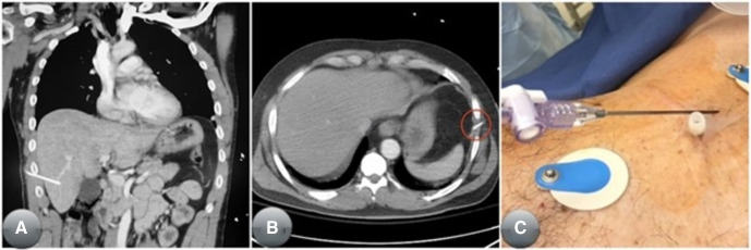NT 삽입의 적절성 평가는, 특히 병원 전 단계 외상과 같이 역동적으로 변화하는 상황에서는 더욱 제한된다. 이번 연구에서 16명(22.5%)의 환자는 외상 소생술 시행 중 TT을 적용받지 않았는데, 이는 CT에서 기흉이나 혈흉이 발견되지 않았음을 의미한다. CT 소견에 따르면 이들 16명은 병원 전 단계에서 NT가 필요하지 않았던 것으로 보인다. 실제 비적응증 NT 시행률은 더 높을 수 있는데, 이는 NT가 시행된 이후 CT에서 발견된 기흉이 의료행위로 인해 발생한 것인지 여부를 판별할 수 없기 때문이다. NT는 적절한 적응증이 있는 경우에도 생명을 위협하는 출혈을 포함한 심각한 합병증을 초래할 수 있다 23. 또한 의료행위로 발생한 기흉에 대한 후속 TT는 환자를 간, 비장, 횡격막, 폐, 심장 손상 등 불필요한 합병증 위험에 노출시킨다 23. 본 연구에서도 NT의 부적절한 삽입으로 복강, 비장, 간에 발생한 의료행위 합병증 사례가 일부 관찰되었으며, 이는 그림 4에 제시되어 있다. 따라서 미국 전역의 EMS 규제 기관들은 의학적으로 불필요한 NT 시행을 최소화할 수 있는 전략을 모색해야 한다.