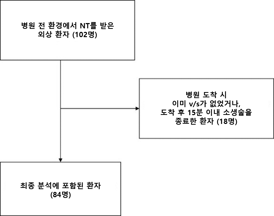 처음 분석에 포함된 102명 환자 중 18명은 병원 도착 당시 활력징후가 없었고 도착 즉시 사망으로 판정되어 제외되었다. 그 결과 최종 분석에는 총 84명의 환자가 포함되었다. 그림 1은 이에 관한 흐름을 보여준다.