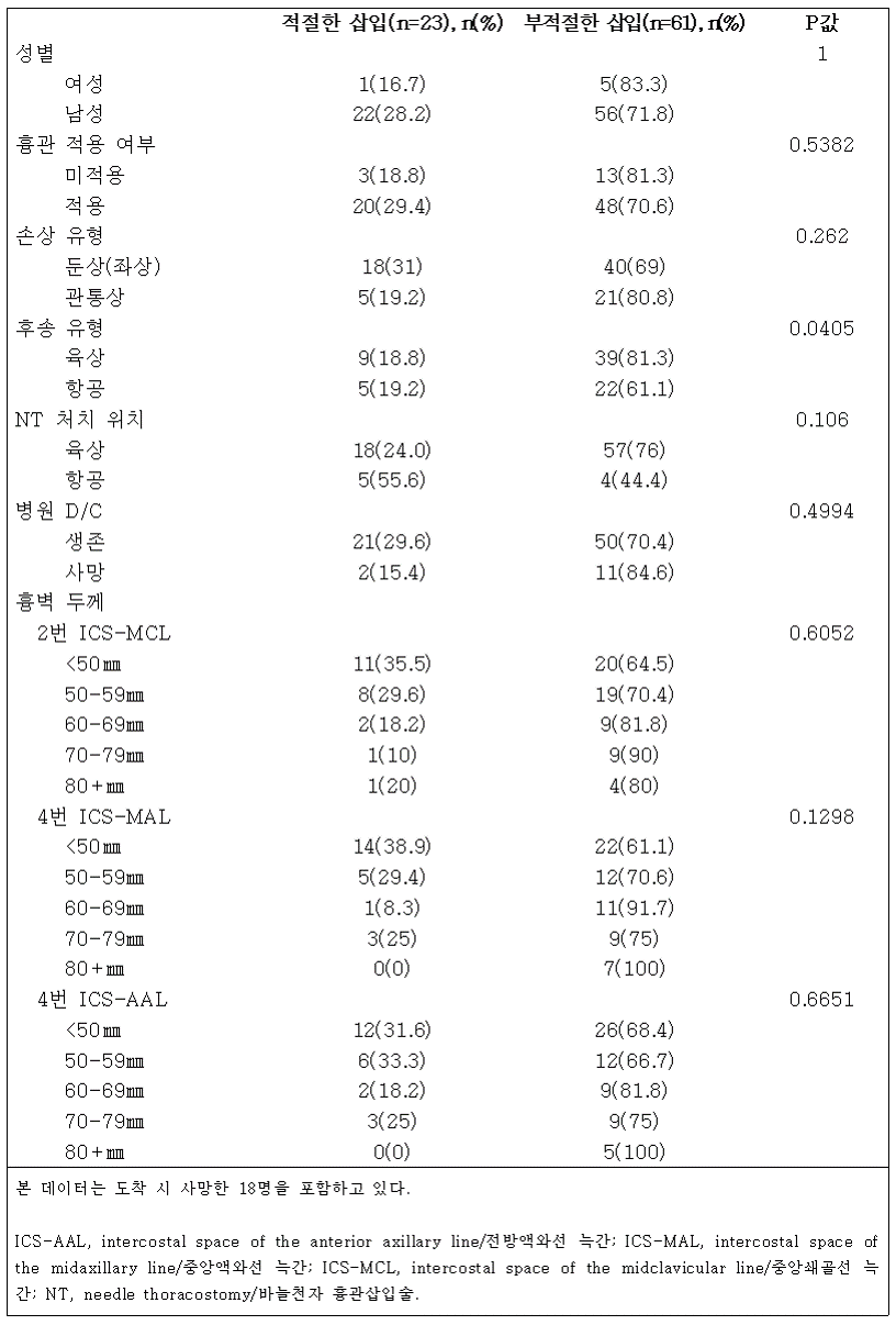 NT 시술(적절한 삽입 vs. 부적절한 삽입)에 따른 변수 비교가 이루어졌으며, 분석 결과는 표 3에 제시되어 있다. 전반적으로 항공 후송은 육상에서보다 적절한 삽입과 더 높은 연관성을 보였다(p=0.0405). 그 외 변수에서는 삽입 상태 간에 통계적으로 유의한 차이가 나타나지 않았다(모든 p>0.05). 예상대로 흉벽이 두꺼운 환자일수록 NT 실패 가능성이 높았다. NT에 실패한 61명 중 20% 이상이 2번 ICS-MCL에서 CWT ≥70㎜(61명 중 13명, 21.3%), 4번 ICS-MAL에서 CWT ≥70㎜(61명 중 16명, 26.2%,), 4번 ICS-AAL에서 CWT ≥70㎜(61명 중 14명, 30.0%)를 보였다(결과는 표 3에 표시되지 않음).