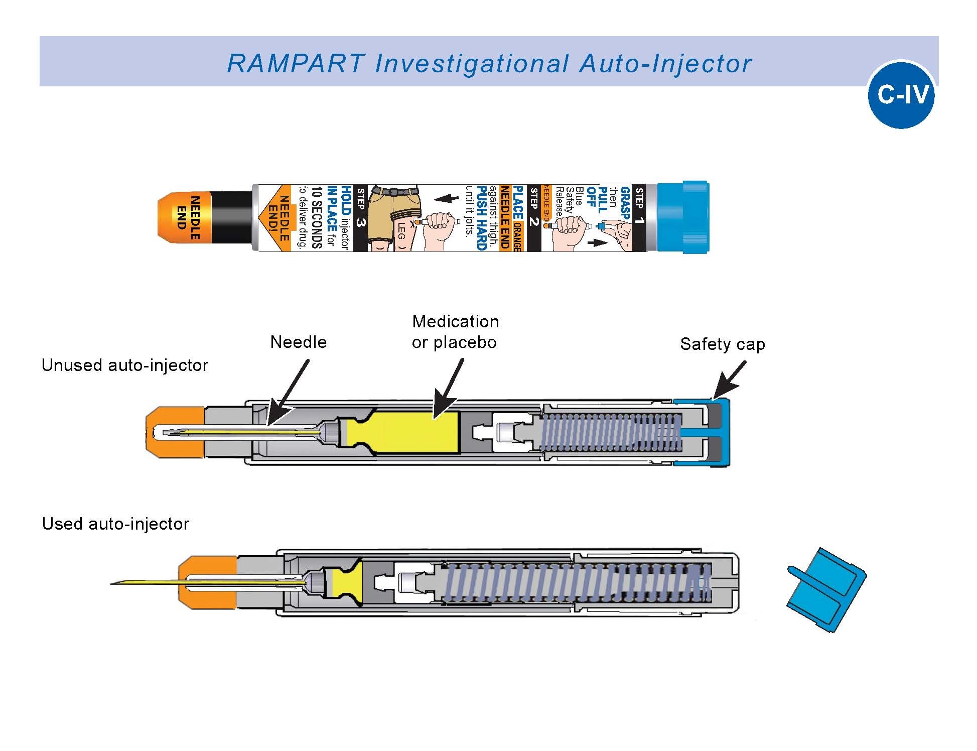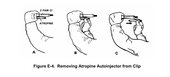 자동주사기의 작동 과정은 단순하다. ⑴ 안전 캡을 제거한다 (아트로핀은 황색 마개, 2-PAM은 회색 마개다). ⑵ 주사할 부위에 수직으로 댄다. ⑶ 그대로 (위 아래 어디든) 누르면 내부 스프링 고정이 해제되면서 바늘이 밀폐 고무와 피하조직을 관통하고 약물이 1-2초간 분출된다. (FM 4-02.285, Appendix E)