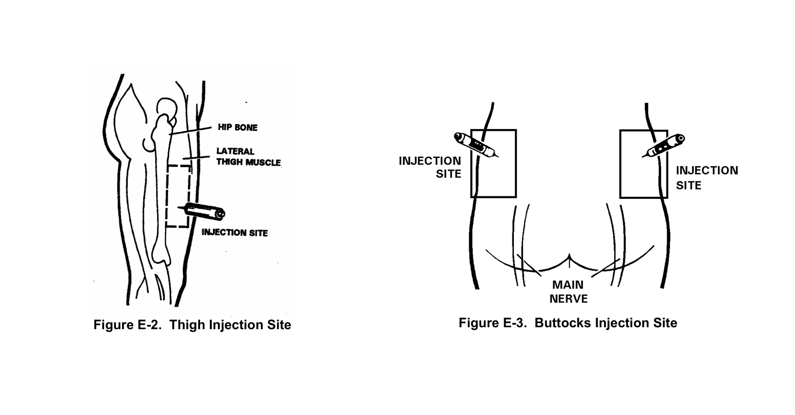 둔부 상외측(gluteus maximus)은 교범상 허용되지만, 피하지방 분포가 개인차가 크고 자기투여 시 수직 각도를 잡기 어렵다는 한계가 있다. 병원에서는 긴 바늘(25–38 mm)을 사용할 수 있기 때문에 둔부도 흔히 사용되지만, 전장의 자동주사기는 바늘 길이가 고정되어 있어 신뢰도가 낮다.