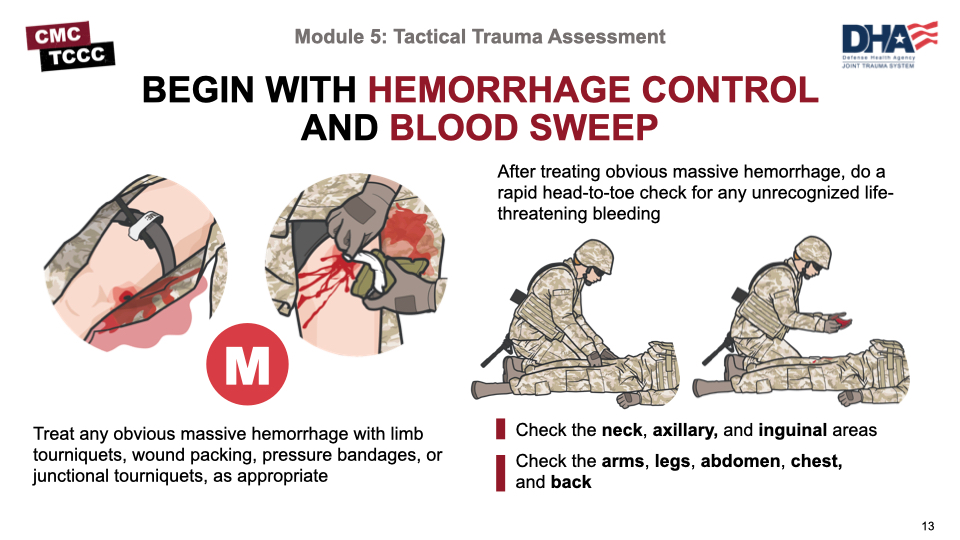 지혈대 재평가가 완료되었다면 이후에는 손바닥 펴 접합부 → 사지 → 흉/복부 및 등을 훑어 추가 출혈 지점이 있는지, 그리고 손가락을 굽혀 갈고리처럼 만들고 이를 동일한 방법으로 긁어 추가 총상(을 포함하는 티슈 탈락 손상)이 존재하는지 확인한다. 이를 블러드 스윕(Blood sweep)이라고 한다.