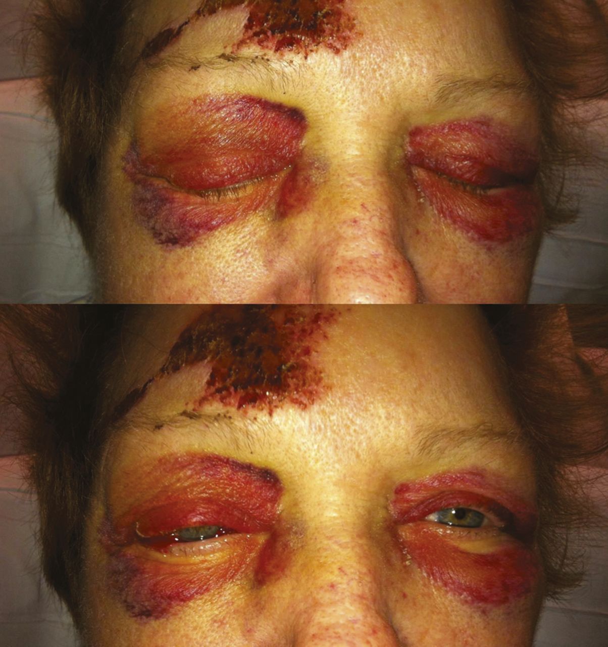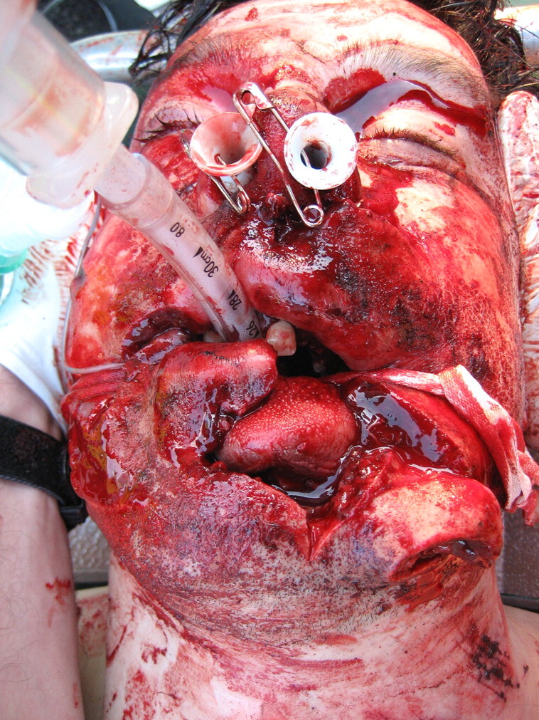 부상자는 눕힌 상태에서 적절한 방법으로 구강을 개방하여 내부 이물질 여부를 확인한다. 이물질이 존재한다 하여 손가락으로 제거하는 것보다는 포셉 등의 도구에 의한 제거 방법이 권장된다(손가락 절단 위험 있음). 그리고 눈에 보이는 이물질만 제거한다(중요하다. 이 이상의 처치는 현장 처치가 아닌, 후송 처치나 Role 3 처치 시설에서 시행될 것이다). 또한 안와골절 징후(Raccoon's eyes)가 있을 때 적극적 개입은 제한되겠다(좌측 사진이 Raccoon's eyes, 우측 사진이 NPA를 적용한 모습이다).