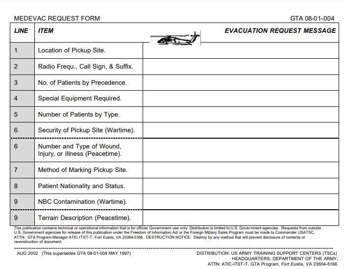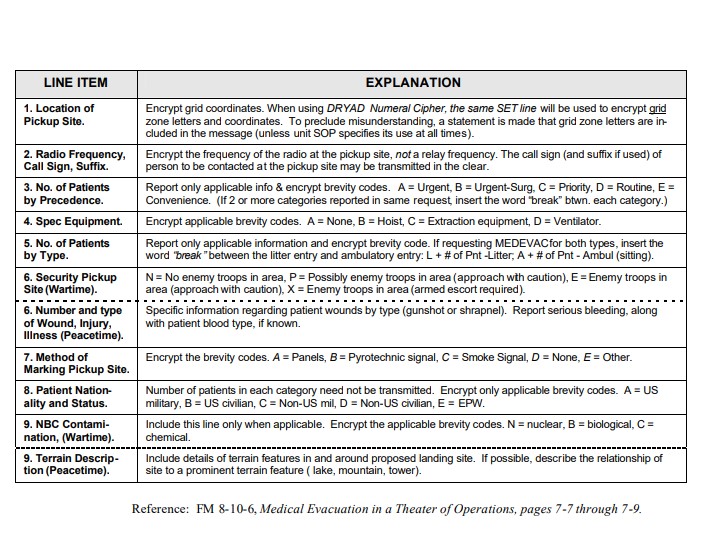 문제는 어떻게 후송 자산을 호출할 것인가 인데, 이를 위해 9-Line reporting이 존재한다. 이에 대한 자세한 정보는 다음 링크를 확인할 것 ↓