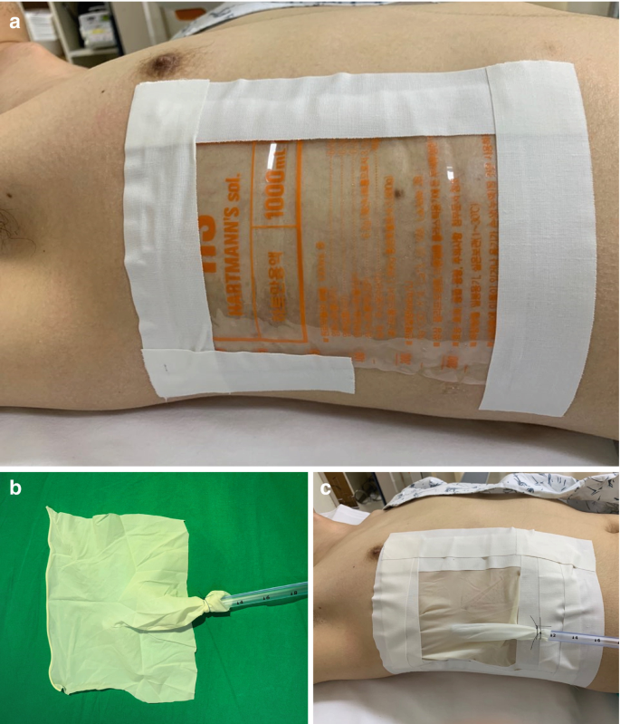 등 부분의 천공은 4면을 밀폐한 드레싱을 적용하되, 흉부의 천공은 바닥을 향하는 방향으로 개방된 3면 밀폐 드레싱을 적용한다. 드레싱을 부착할 때는 들숨(흡기)이 아니라 날숨(호기)에 시도하여야 하겠다.