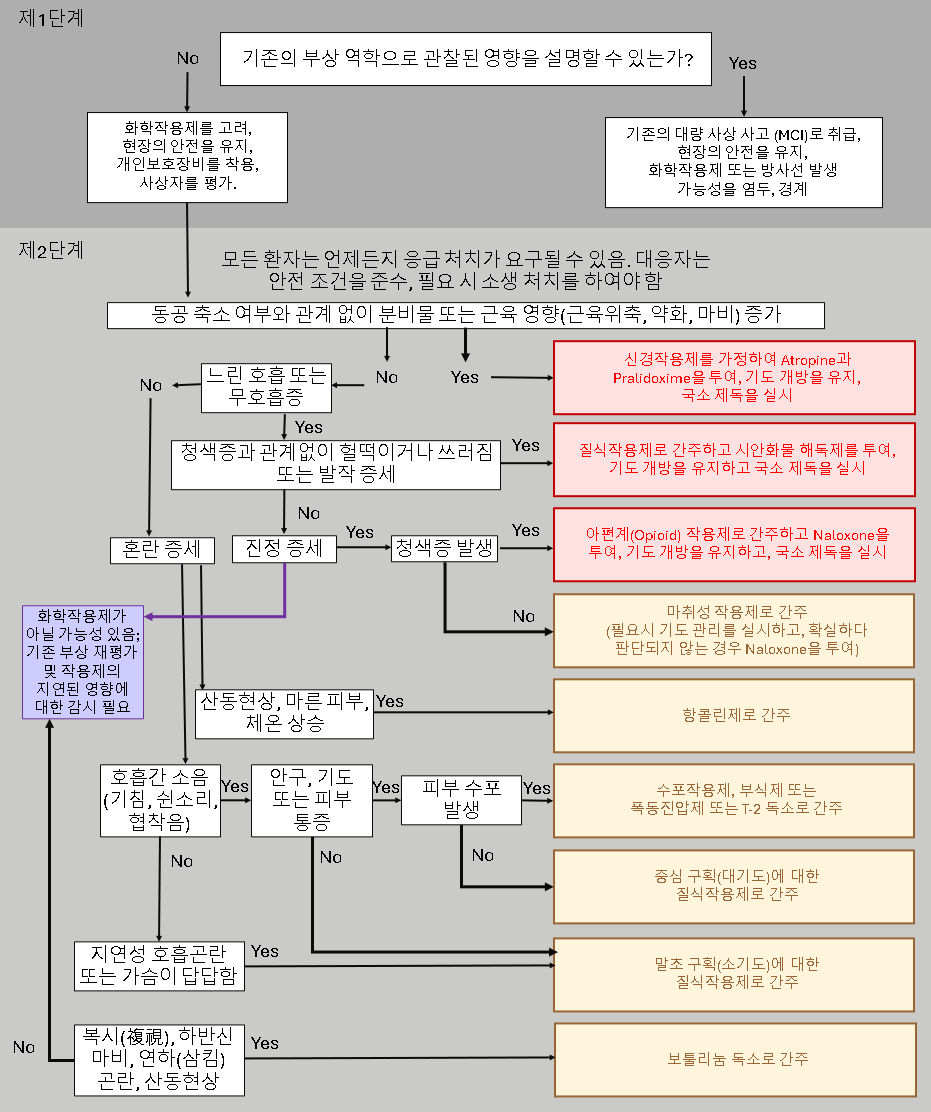 각 작용제 범주에 대한 신속 참조 카드(Rapid Reference Card)가 포함되어 있으며 신속 참조 카드에 포함된 권장 사항에 대한 논의는 아래 본문에 나와 있다. 또한, 아래의 흐름도는 임상 증상에 기반하여 화학전 작용제에 대한 신속한 부상자 분류(Triage, 트리아지)를 수행하는 데 참고할 수 있다. 진단 검사 및/또는 치료 결정은 각 치료 단계에서의 자원 가용성과 전술적 상황에 따라 이루어진다. '전술적전투부상자관리 지침(Tactical Combat Casualty Care Guidelines)'은 'JTS 핵 및 화생방 부상 대응 파트 I: 초기 대응 임상 실무 지침서(JTS Chemical, Biological, Radiological and Nuclear Injury Response Part I: Initial Response Clinical Practice Guideline)'에 설명된 대로 (MARCHE)²를 사용하여 화학물질에 노출된 부상자 치료에 통합되어야 한다.²