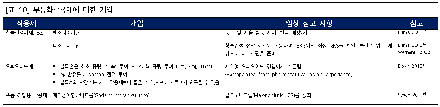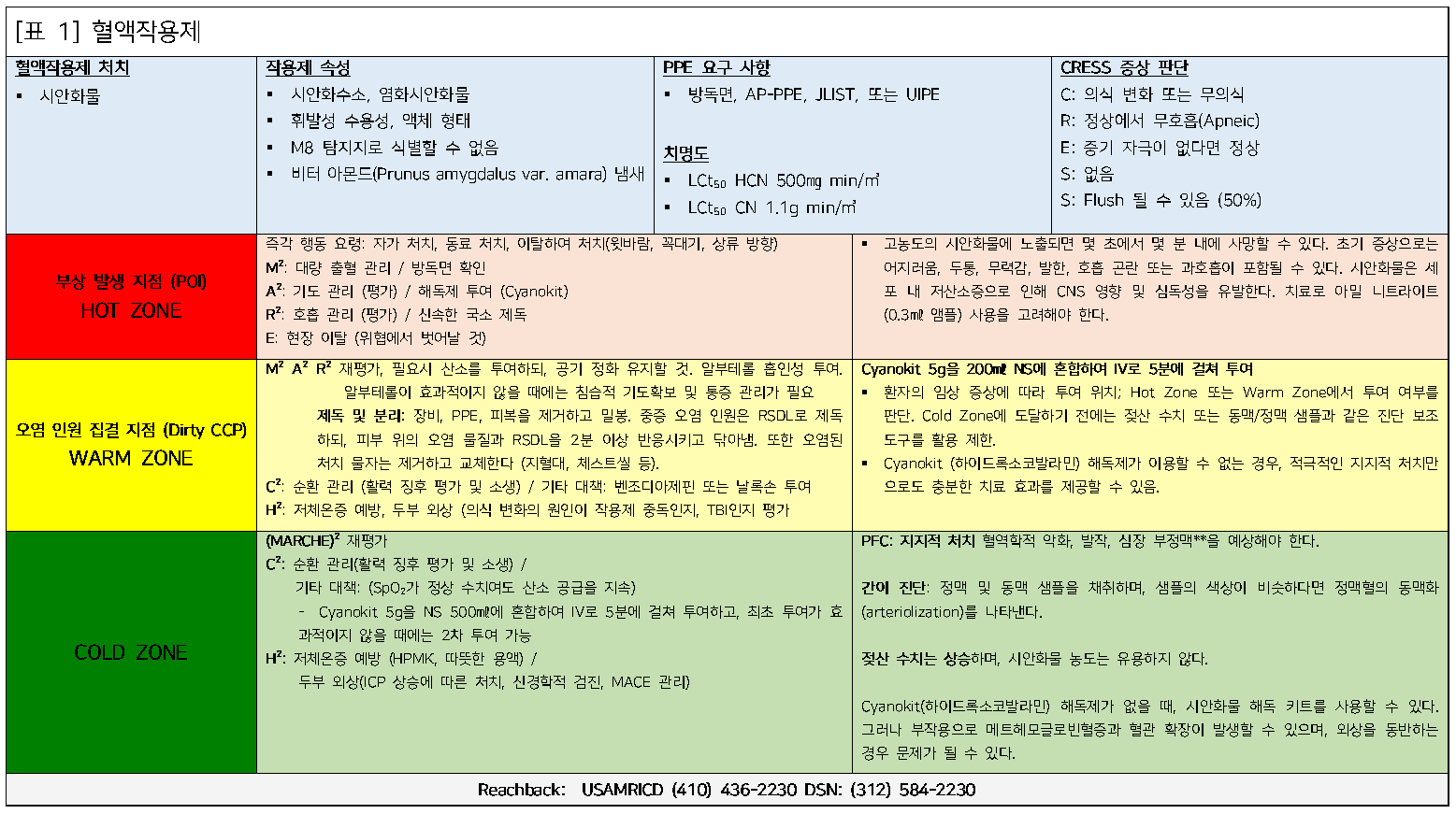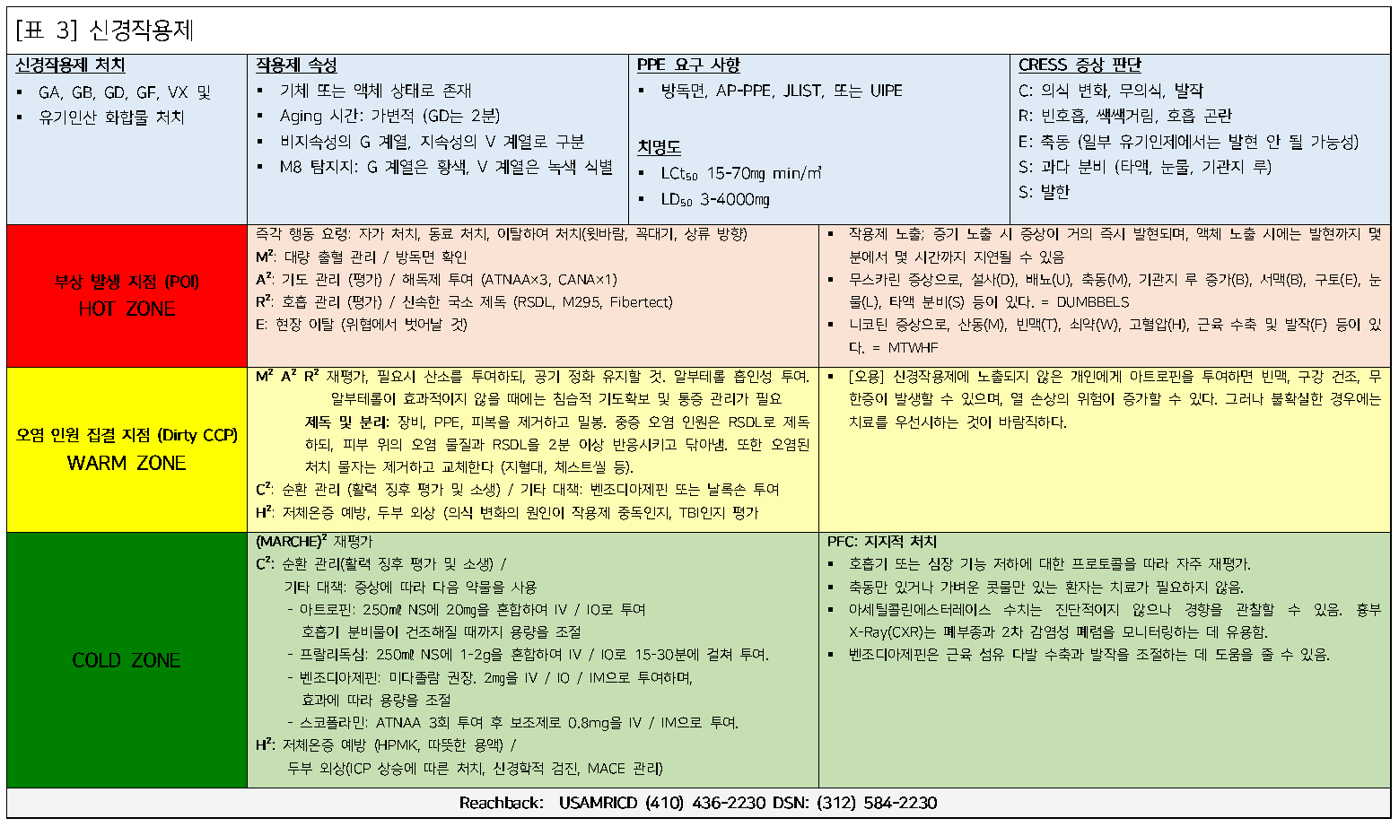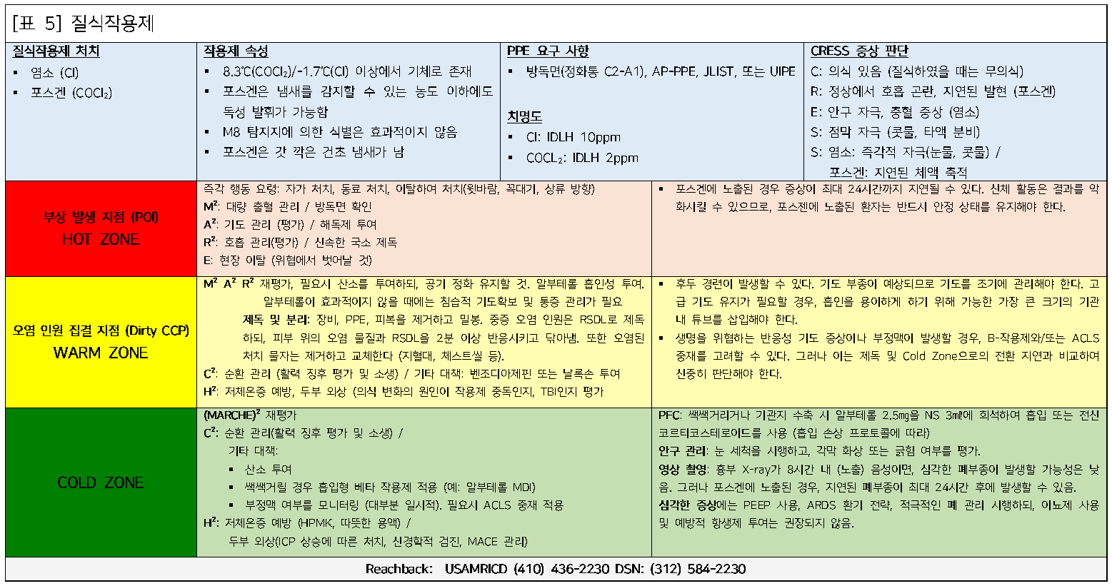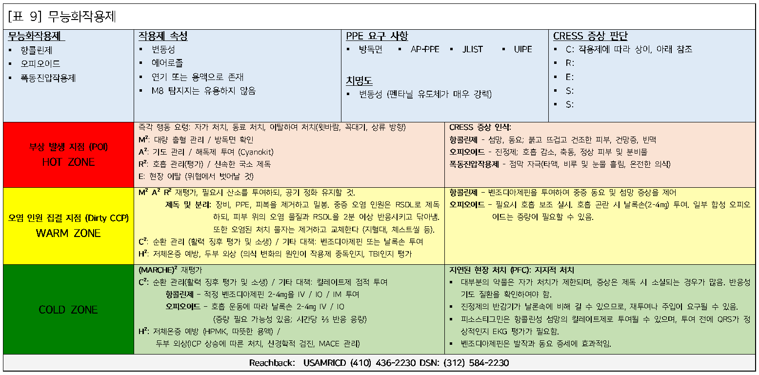 다음은 부상 발생 지점(POI)부터 Role 3 (3단계 처치 지점, TEC/Cold Zone)에 이르기까지의 치료 연속성에서 특정 화학작용제에 대한 의료적 관리에 대한 검토임. 보다 자세한 정보는 '화학 및 생물학적 부상자 현장 관리 핸드북(Field Management of Chemical and Biological Casualties Handbook)'에서 확인할 수 있다.¹