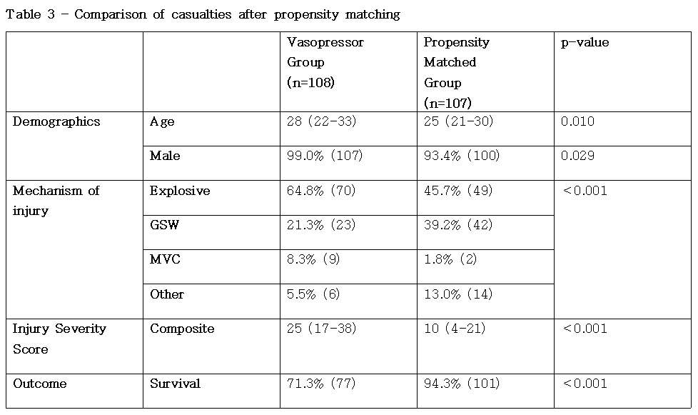 승압제 투여 그룹은 성향 점수 매칭 그룹과 비교했을 때, 폭발물 및 차량 사고에 의한 부상율이 더 높았지만, 총상 및 기타 다양한 기전에 의한 부상 비율은 보다 낮은 수치를 보였다. 또한, 승압제 투여 그룹은 더 높은 중앙값 손상정도계수를 보였다. 병원 퇴원 생존율은 승압제 투여 그룹에서 더 낮게 나타났다(71.3% 대 94.3%, p < 0.001) (표 3).