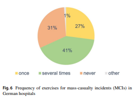 이와 함께 우리는 독일 외상센터에서 대량 사상자 훈련이 얼마나 자주 실시되는지도 물었다(그림 6). 응답자의 절반 이상은 그러한 훈련이 한 번도 실시된 적이 없거나 단 한 차례만 이루어졌다고 답했다.