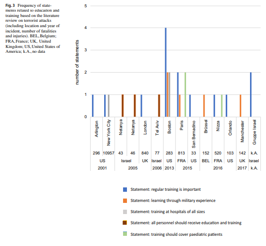 문헌 분석 결과, 특히 2013년 보스턴 마라톤 폭탄 테러, 2015년 파리 테러, 2016년 니스 테러는 대량 사상자 테러 상황에 대비한 교육 및 훈련 개선에 관한 여러 권고사항을 이끌어낸 주요 사건이었다.