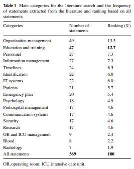 다음 목표는 이러한 주요 범주와 관련하여 문헌에서 반복적으로 등장하는 진술과 교훈들을 식별하는 것이었다. 이 접근 방식을 통해 우리는 "교육 및 훈련"이라는 주요 범주에서 총 47개의 진술을 문헌에서 추출할 수 있었으며, 이 중 7개는 여러 논문에서 공통적으로 언급된 것이었다(표 1).