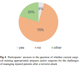 우리의 설문지는 독일의 현재 외과 수련이 테러 공격으로 부상한 환자 치료에 있어 젊은 외과의들을 충분히 준비시키고 있는지를 묻는 항목을 포함하고 있었으며(그림 4), 대부분의 응답자는 이에 대해 현재로서는 그렇지 않다고 명확히 응답했다.