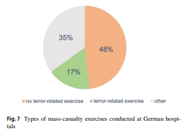또한, 실시된 훈련이 테러와 관련된 시나리오를 기반으로 했는지 여부에도 관심을 가졌으며(그림 7), 그 결과 독일 외상센터에서 진행된 훈련 중 거의 절반은 테러와 관련 없는 내용이었다. 기타 항목에는 구체적인 정보가 없는 모든 응답이 포함되었다.