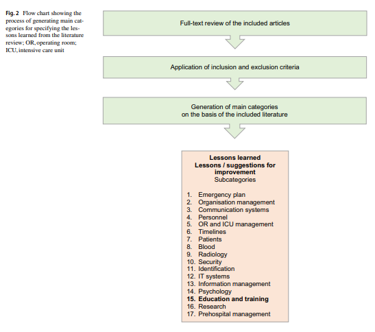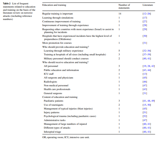 체계적 고찰을 통해 반복적으로 나타나는 진술과 권고사항들을 확인할 수 있었다. 핵심적인 권고는 시나리오 기반의 정기적인 훈련이 이루어져야 하며, 해당 시나리오는 가능한 한 현실적이어야 하고 병원 전 직원을 포함해야 한다는 점이었다. 또한 총상 및 폭발 외상 처치에 있어 군사적 전문성과 역량이 통합되어야 한다는 점도 강조되었다. 이와 더불어, 독일 병원의 의학 지도자들은 현재의 외과 교육 및 훈련이 테러 사건으로 인해 심각한 부상을 입은 환자를 관리하는 데 있어 젊은 외과의들을 충분히 준비시키지 못하고 있다고 평가했다.