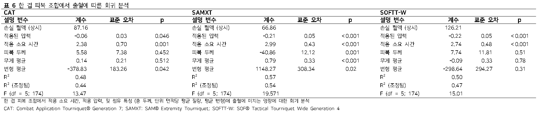 단일 층 피복 조건(전투복 하의, 절단 방지용 하의, 합성소재 오토바이 하의, 가죽소재 오토바이 하의)에 대한 회귀 분석에서도 적용 압력과 적용 시간이 모든 지혈대에서 출혈량과 강한 상관관계를 보였으며, 다중공선성 가정이 위배되지 않았다. 테스트된 섬유 특성 중에서는 CAT 지혈대의 경우 평균 변형이 유의미한 영향을 미쳤으며, SAMXT 지혈대의 경우 모든 섬유 특성(두께, 중량 평균, 변형 평균)이 유의미한 영향을 미쳤다. 그러나 세 가지 피복류 특성(두께, 평균 중량, 평균 변형)은 모든 지혈대에서 일관되게 다중공선성 가정을 위배하는 것으로 나타났다(표 6).
