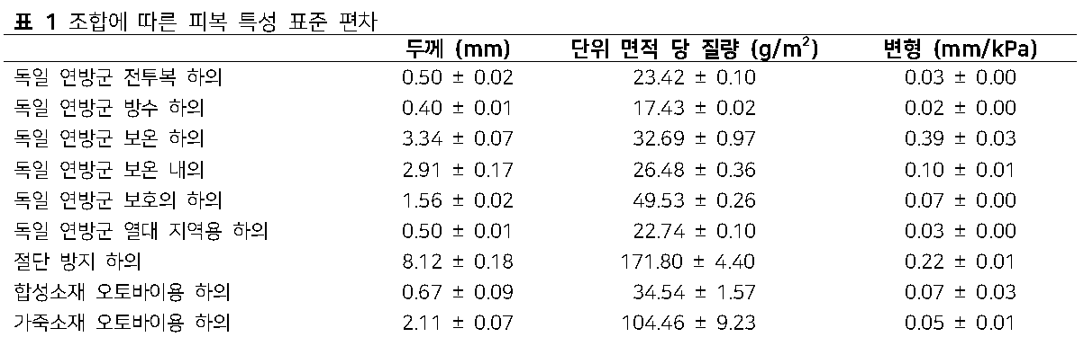 두께, 단위 면적당 질량(mass per unit area), 변형률(deformation)을 측정함으로써 지혈대의 효과와 관련된 객관적인 섬유 매개변수를 확인하고자 했다. 그러나 이러한 피복 매개변수는 이전 연구에서 평가된 적이 없으며, 지혈대 모델, 적용된 압력, 적용 시간에 비해 출혈량에 미치는 영향이 훨씬 적었다(표 5, 6). 현실적인 시나리오를 선택하기 위해 일부 실험에서는 여러 겹의 피복을 겹쳐 착용하는 구성을 포함시켰다. 그러나 이러한 구성에서는 각 층이 다른 층에 미치는 영향이 고려되어야 하며, 예를 들어, 층 간 마찰이 섬유 매개변수에 대한 회귀 분석의 타당성을 제한했을 가능성이 있다. 따라서 단일 층 피복 환경에서 별도의 회귀 분석을 수행했다. 섬유 매개변수는 통계적으로 유의미한 변화를 유발했으나, 다중공선성(multicollinearity) 가정의 위반으로 인해 어떤 변수가 가장 큰 영향을 미쳤는지에 대한 확실한 결론을 도출할 수 없었다. SAMXT 지혈대는 피복 층의 영향을 가장 많이 받았다. 그러나 피복을 착용하지 않은 상태에서 측정된 출혈량, 적용 압력, 적용 시간의 기준값이 충분한 수준을 유지했기 때문에(표 2, 3, 4), 피복이 미치는 임상적 영향은 크지 않았다. 반면, SOFTT-W의 경우 피복이 없는 상태에서의 기준값이 임계 한계치에 가까웠다. 이는 피복의 영향이 크지 않더라도 이 지혈대만으로 항상 지혈이 보장되지 않을 수 있음을 의미한다. CAT 지혈대는 피복 구성의 영향을 가장 적게 받았으며, 피복을 착용하지 않은 상태에서의 기준값도 임계 한계치에서 가장 멀리 떨어져 있었다. 이 외에도 직물의 휨 강성(bending stiffness)과 같은 다양한 섬유 매개변수가 지혈대 효과에 영향을 미칠 수 있다. 그러나 본 연구에서는 피복의 두께 때문에 이러한 변수를 평가할 수 없었다. 결과적으로, 가죽 소재를 제외하면 다른 피복 유형에 따른 차이는 임상적으로 큰 의미를 갖지 않는 것으로 보이며, 가죽 소재 오토바이 하의는 적용 압력을 유의하게 낮추고 출혈량을 증가시키는 경향을 보였다.