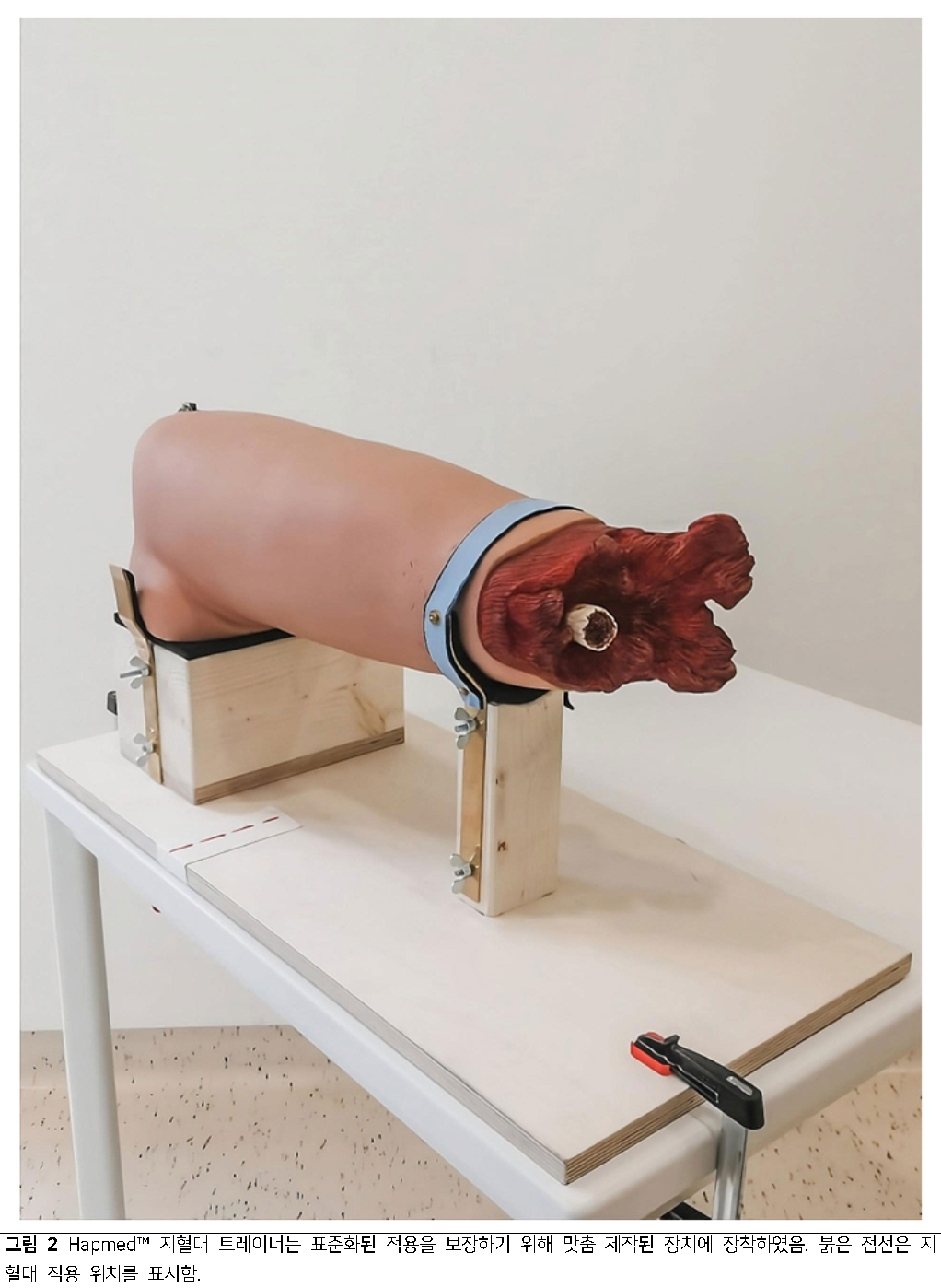 두 명의 숙련된 제공자(AO, YB)는 연구 참여에 대한 사전 동의를 제공했으며, 올바르고 신속한 지혈대 적용을 달성할 수 있을 때까지 지혈대 모델 사용법에 대한 훈련을 받았다. 두 제공자는 각 피복 조합에서 각 지혈대를 양손으로 10회씩 적용했다. 또한, 제공자들은 지혈대 트레이너의 디스플레이를 볼 수 없도록 블라인드 처리되었다. 지혈대 트레이너는 표준화된 적용을 보장하기 위해 맞춤 제작된 장치에 장착되었다(그림. 2). 두 제공자는 바닥의 표시선을 기준으로 테이블에서 1m 떨어진 위치에 서서 한 손에 열린 지혈대를 들고 대기했다. 시간 측정자의 신호가 주어지면, 최대한 신속하고 단단하게 지혈대를 적용하였으며, 붉은 점선의 높이에 맞춰 배치했다. 시간 측정은 윈들라스(windlass)가 고정된 순간 종료되었다.