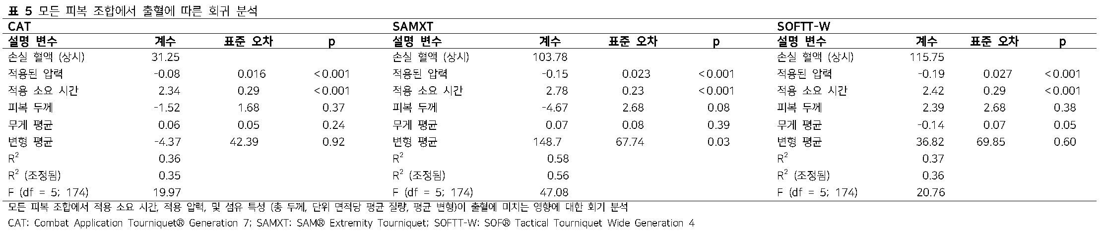 피복 조건에 대한 회귀 분석 결과, 적용 압력과 적용 시간이 모든 지혈대에서 출혈량과 강한 상관관계를 보였다. 테스트된 섬유 특성 중에서는 SAMXT의 경우 평균 변형(mean deformation)만 유의미한 영향을 미쳤다. 또한 다중공선성(multicollinearity)은 관찰되지 않았다(표 5).