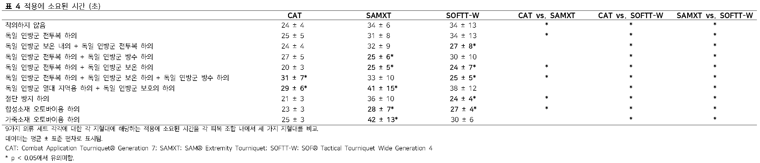 SOFTT-W의 경우, 모든 피복 조건에서 적용 시간이 피복을 착용하지 않은 조건과 비교했을 때 유의미한 차이가 없거나 유의미하게 감소했다. 반면, SAMXT는 열대 지역용 하의 + 방수 외피 조합 및 가죽 오토바이 하의 조건에서 적용 시간이 유의미하게 증가했다. CAT의 경우 전투복 하의 + 보온 하의 + 방수 하의 조합 및 열대 지역용 하의 + 방수 외피 조건에서 적용 시간이 유의미하게 증가했다. CAT 지혈대는 가장 일관된 적용 시간을 보였으며, 두 가지 예외를 제외하면 가장 빠른 적용 시간을 기록했다(표 4).