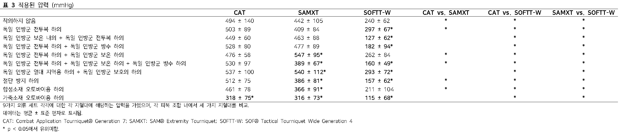 SOFTT-W의 평균 적용 압력은 보온 내의 + 전투복 하의, 전투 하의 + 보온 하의 + 방수 하의, 절단 방지용 하의, 가죽 오토바이 하의 조건에서 180 mmHg 기준선 이하로 유지되었다. 그 외 모든 조건에서는 180 mmHg를 초과했다. 모든 피복 조건에서 SOFTT-W의 압력은 CAT 및 SAMXT보다 유의미하게 낮았다. 가죽 오토바이 하의 조건에서는 세 가지 지혈대 모두 피복을 착용하지 않은 조건보다 유의미하게 낮은 압력을 생성했다. 다른 피복 조건에서는 피복을 착용하지 않은 조건과 비교했을 때 일부 경우에서 유의미한 차이가 있었으나, 모든 지혈대에서 일관된 차이가 나타나지는 않았다(표 3)